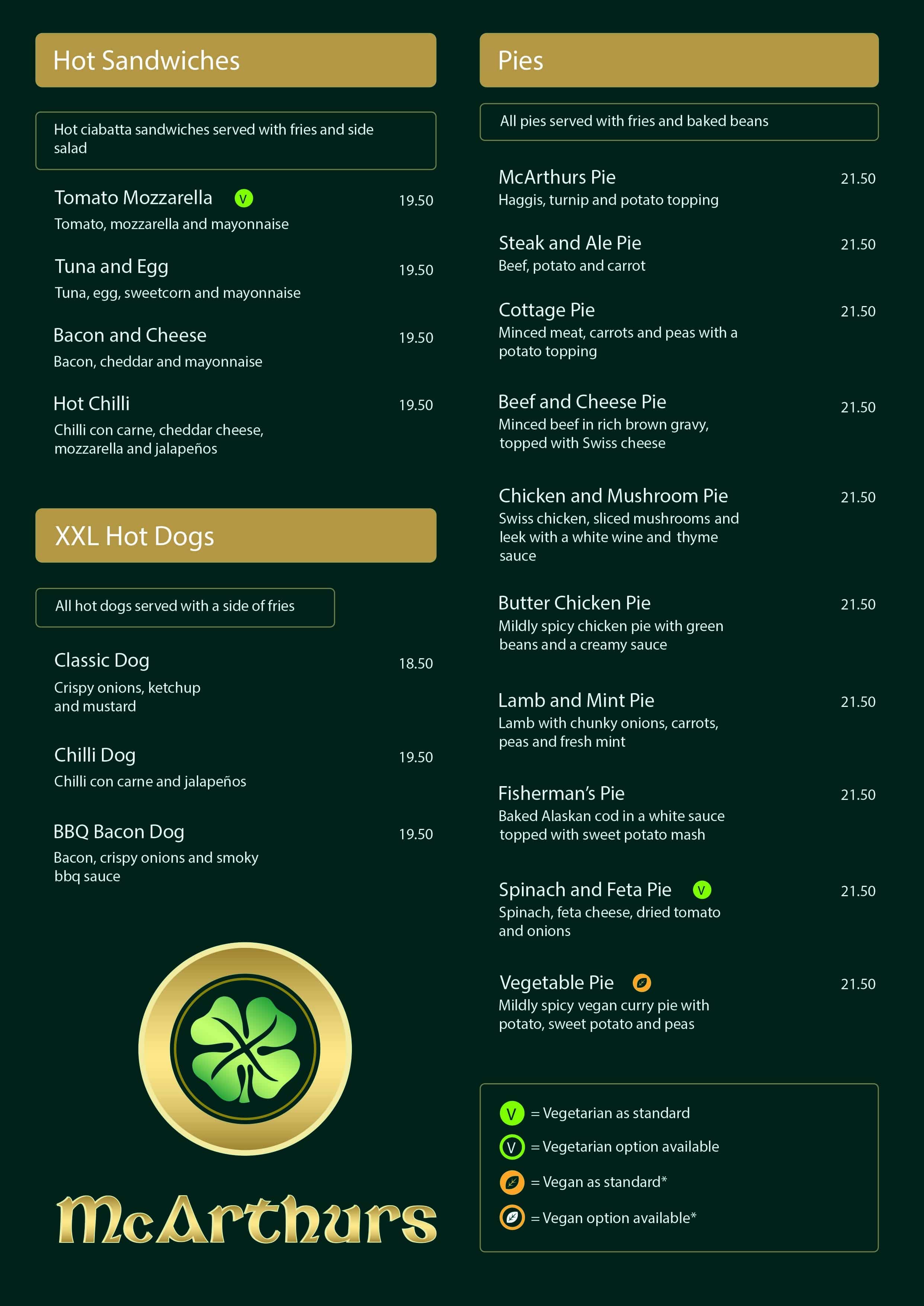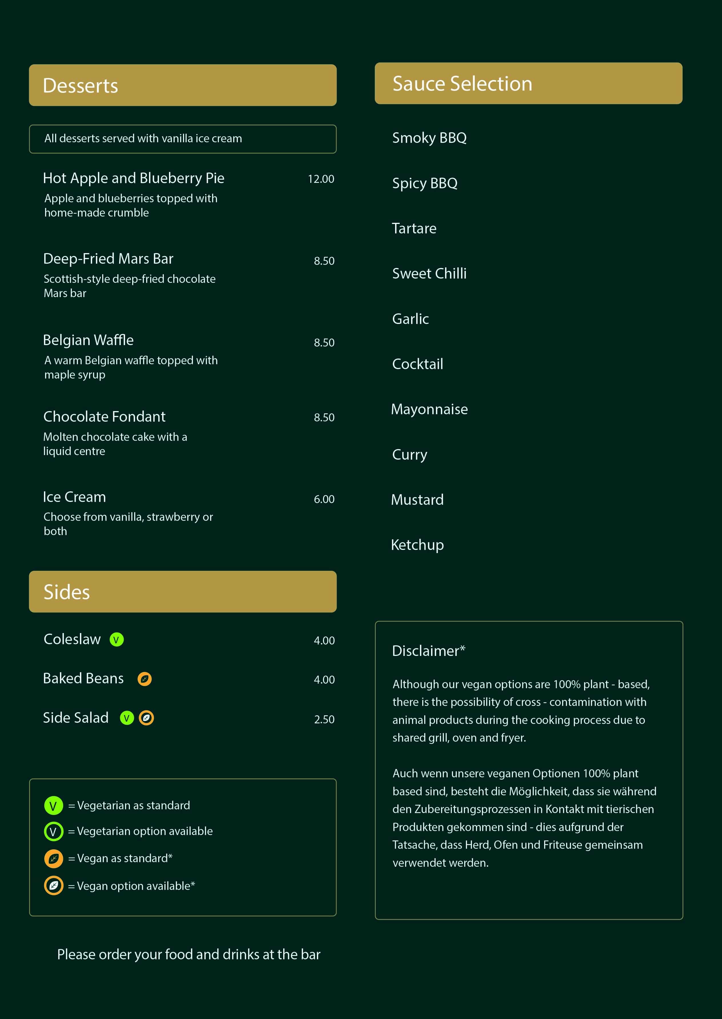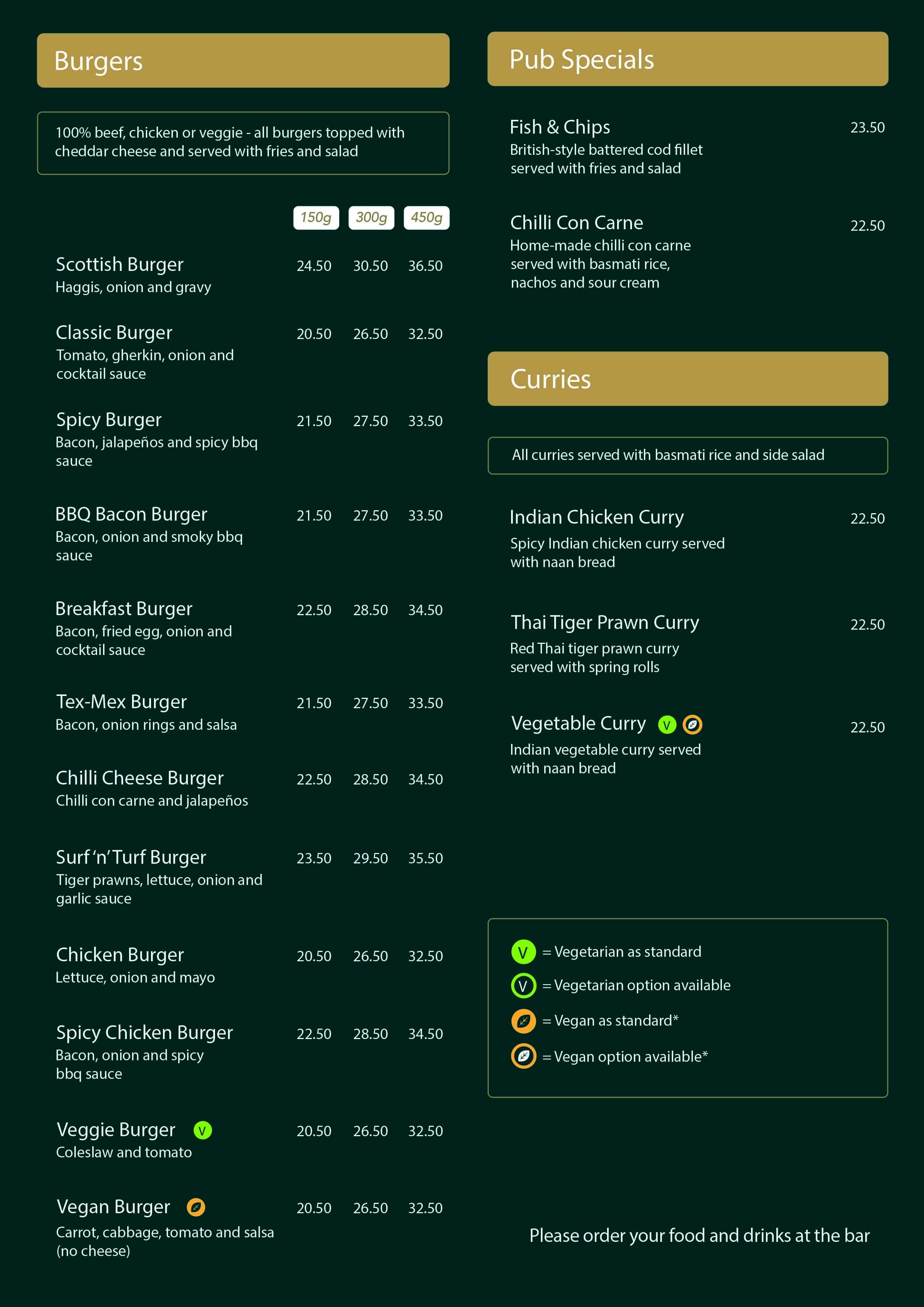 Our menus include vegan and vegetarian options and are served all day long. Don’t miss our famous Burger Night and Wing Specials.